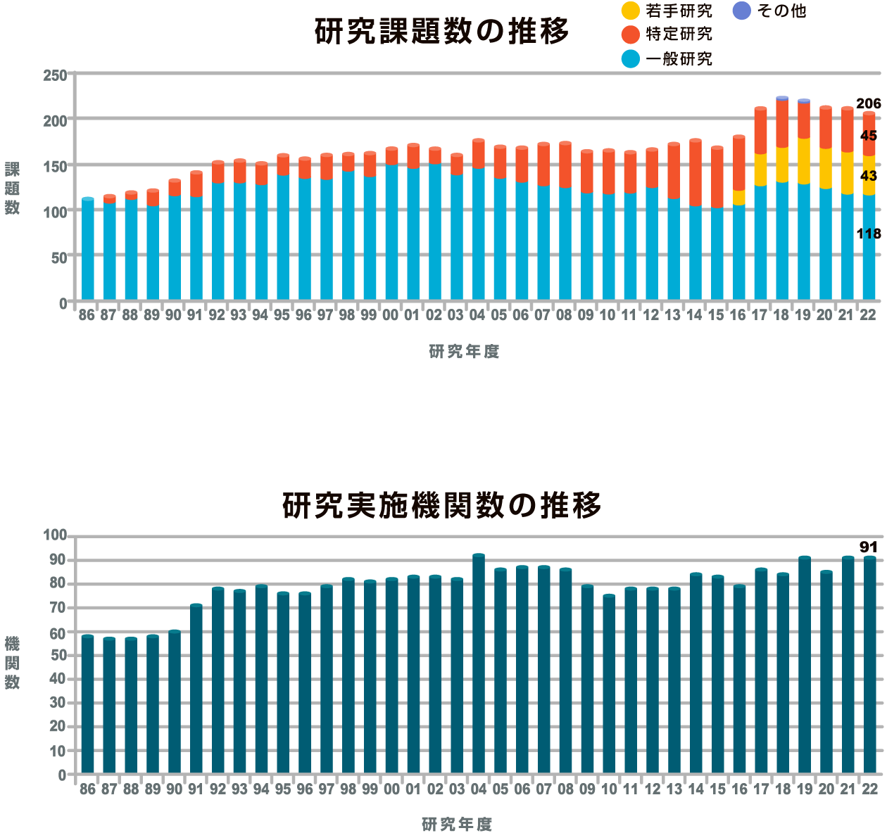 当財団の研究助成事業の規模は設立以来徐々に拡大し、対象の研究課題の数と研究実施機関(大学、研究所等)の数は、図のように推移してきました。また、一般研究、特定研究に加え、2016年度より新たに若手研究助成を開始しました。2025年度は、87機関の189課題を対象に助成を行います。